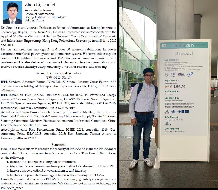 2019年5月25日至29日,北京理工大学太阳成集团tyc122ccvip青年教师李震副教授出席于日本札幌举行的IEEE电路与系统学会旗舰会议ISCAS2019(IEEE International Symposium on Circuits and Systems)。与会期间,通过IEEE电路与系统学会执行主席提名,学会旗下两大期刊编委会(IEEE Transactions on Circuits and Systems I/II)与能源专委会统一投票,李震副教授成功当选IEEE电路与系统学会能源专委会(PECAS)候任主席(Chair Elect,2021年至2022年),并将于2022年至2023年直接升任总主席,上任后将成为IEEE PECAS三十年历史上第一位来自中国大陆地区的总主席。在2020至2023的四年中,李震副教授将负责IEEE电路与系统学会能源专委会全球事务的管理与推广,并统筹专委会、学会期刊能源领域的发展方向。