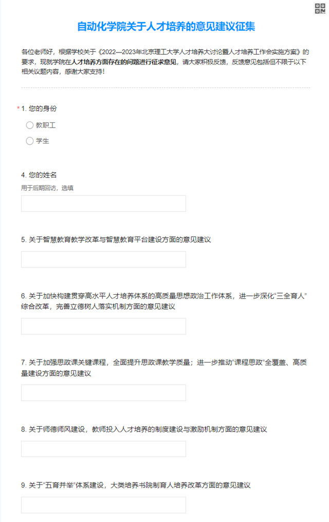 太阳成集团tyc122ccvip从2022年10月开始,面向全院师生,采用问卷调查和座谈会的形式,在智慧教育教学改革与平台建设,高水平人才培养体系和思想政治工作体系的构建,师德师风建设,实践课程体系改革,创新创业教育与人才培养等二十一个方面进行了师生意见建议的征集与收纳。本轮人才培养大会的意见征集范围覆盖了全院教师和本硕博各培养层次的学生,并结合问卷结果与座谈会讨论内容,梳理归纳而后成立了人才培养问题库。下一步将针对热点痛点,进行研讨推进落实。