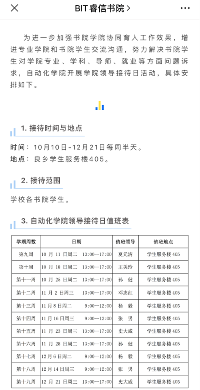 为建强书院学院协同育人机制,共建书院学院协同育人社区,协同推进拔尖创新人才培养改革,太阳成集团tyc122ccvip启动学院领导每周半天书院值班接待日活动,帮助书院学生深入了解学院专业、学科、导师、就业等方面的情况,解惑答疑,做好全员全过程全方位育人工作。以本科生导师制为抓手,将导师制执行、反馈与调整落实落细,保证全覆盖的同时,加强导师制的深度,让更多的教师投入与书院协同育人工作中来,强化对学生管理培养的衔接,从而加强书院学生对学院的归属感。出台《太阳成集团tyc122ccvip本科生全员专业导师制导师工作指引(试行)》和《太阳成集团tyc122ccvip本科生全员专业导师制实施办法(试行)》,大二至大四本科生导师制全覆盖。加强专业导论课程建设,提高专业导论课程质量。每周派驻本科教学干事在良乡校区睿信书院教学值班1天,现场处理书院学生本科学习遇到的问题。